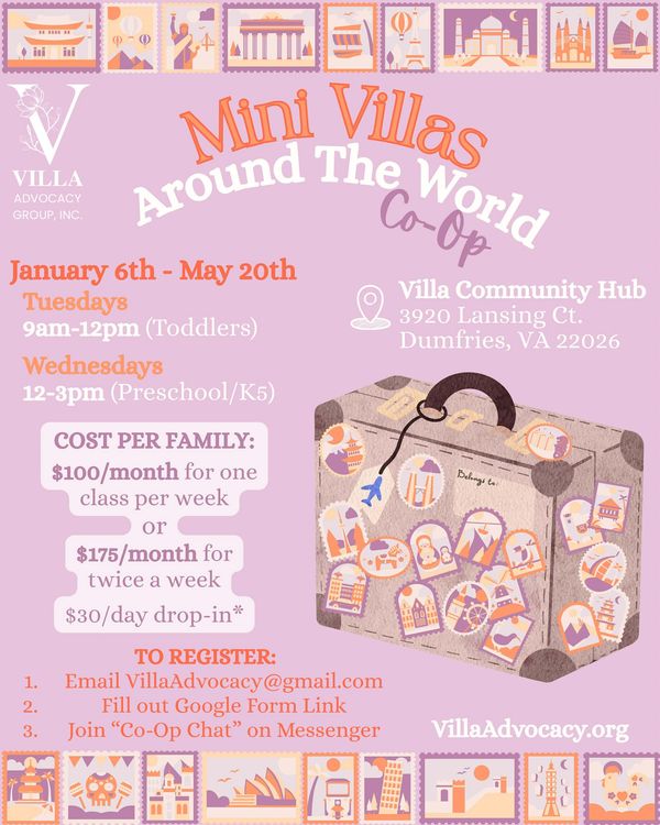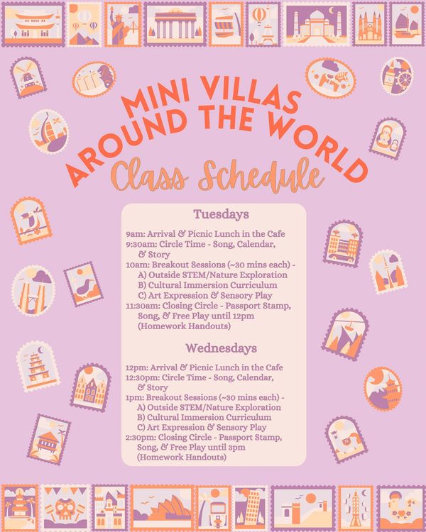 🛬🤎 Hop back on board!!! It’s time for Mini Villa Airlines to jet-set around the globe once more for “Mini Villas Around The World” Co-Op! 🧳 It will be an indoor/outdoor program focusing on Cultural Immersion, STEM, Nature, & Phonics! The program will run 2 days a week, but families can choose how many days they attend weekly, or opt for drop-in as needed!